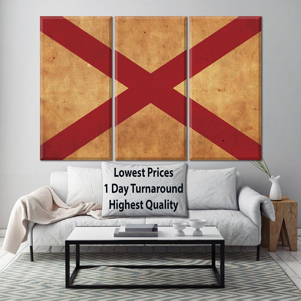 Vintage created Alabama Flag. Show your Southern Pride. Great for a piece of wall art. Available as a SINGLE canvas at 16″ x 24″ , 24″ x 36″ , or 32″ x 48″ or a 3 panel work of art canvas as 5 x 3 foot wide.