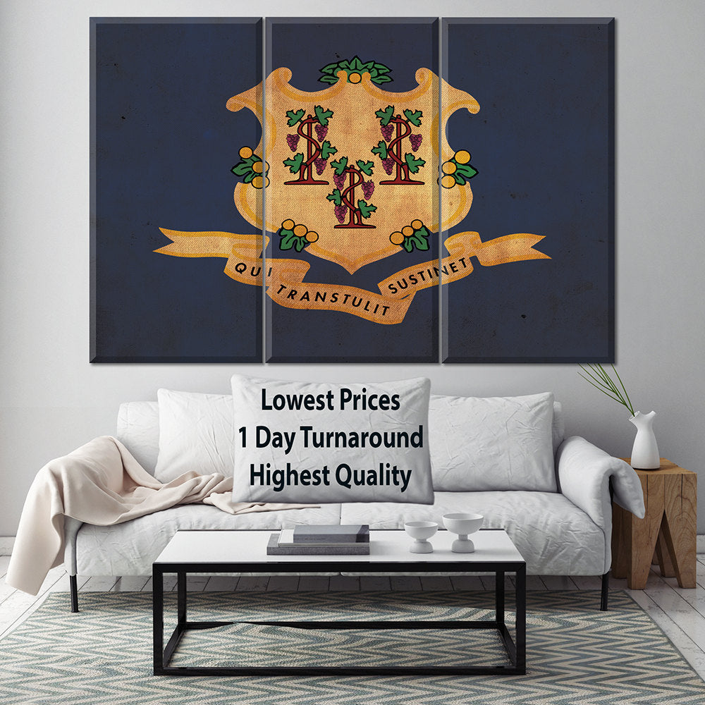 Vintage created Connecticut Flag. Show your Northeast Pride. Great for a piece of wall art. Available as a SINGLE canvas at 16″ x 24″ , 24″ x 36″ , or 32″ x 48″ or a 3 panel work of art canvas as 5 x 3 foot wide.