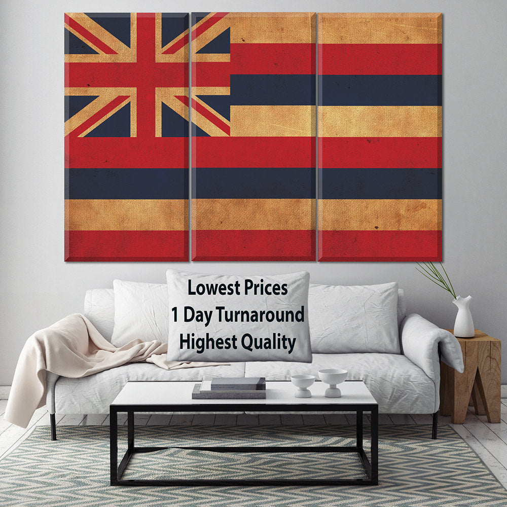 Vintage created Hawaii Flag. Show your Hawaiian Pride. Great for a piece of wall art. Available as a SINGLE canvas at 16″ x 24″ , 24″ x 36″ , or 32″ x 48″ or a 3 panel work of art canvas as 5 x 3 foot wide.