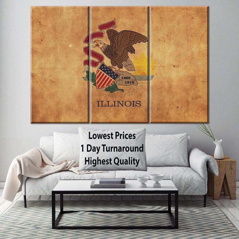Vintage created Illinois Flag. Show your Midwest Pride. Great for a piece of wall art. Available as a SINGLE canvas at 16″ x 24″ , 24″ x 36″ , or 32″ x 48″ or a 3 panel work of art canvas as 5 x 3 foot wide.