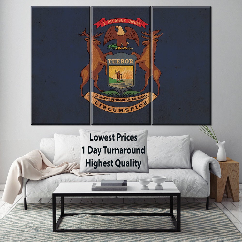Vintage created Michigan Flag. Show your Michigan Pride. Great for a piece of wall art. Available as a SINGLE canvas at 16″ x 24″ , 24″ x 36″ , or 32″ x 48″ or a 3 panel work of art canvas as 5 x 3 foot wide.