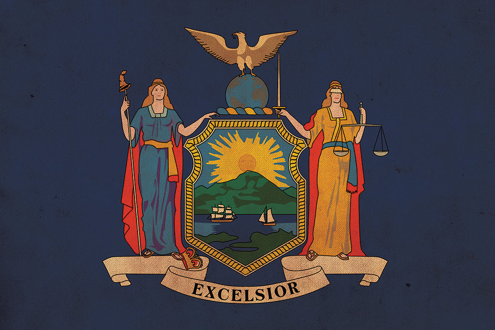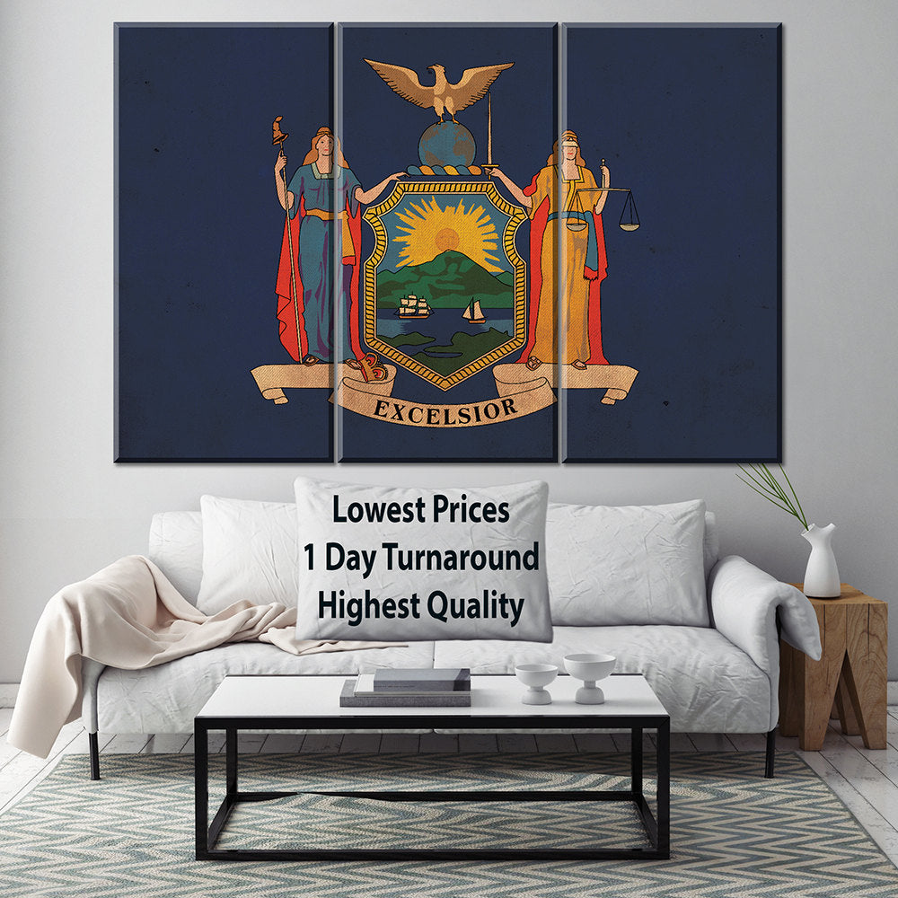 Vintage created New York Flag. Show your New York Pride. Great for a piece of wall art. Great for a piece of wall art. Great for a piece of wall art. Available as a SINGLE canvas at 16″ x 24″ , 24″ x 36″ , or 32″ x 48″ or a 3 panel work of art canvas as 5 x 3 foot wide.