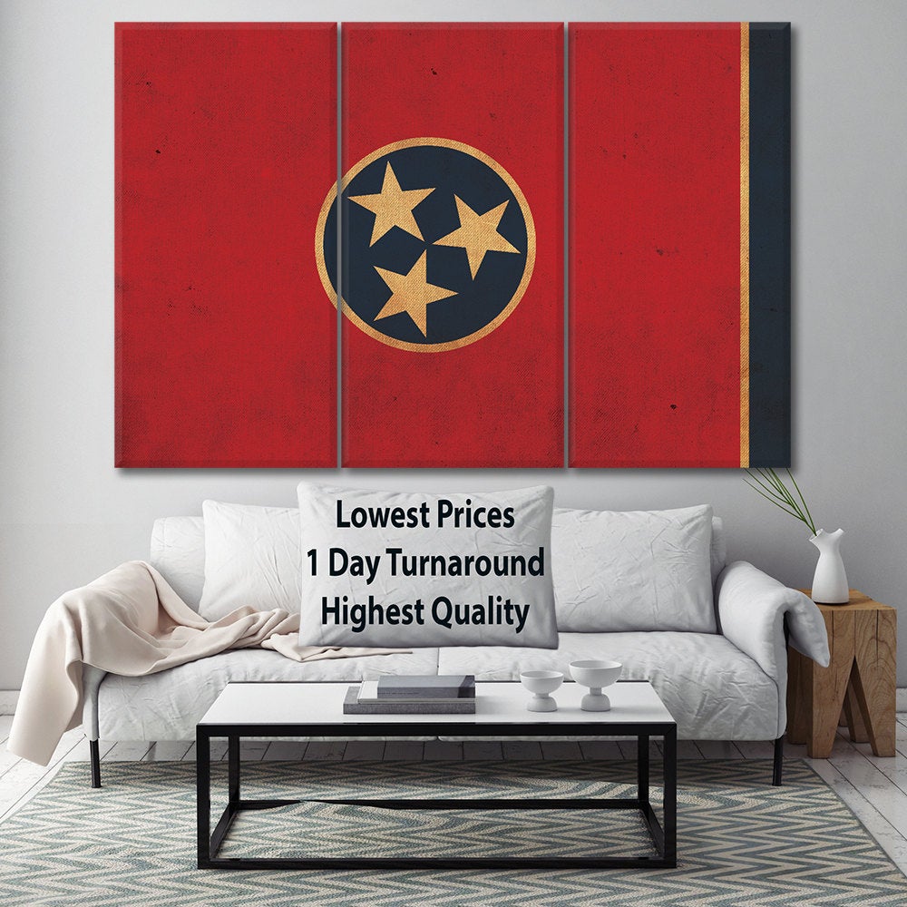 Vintage created Tennessee Flag. Show your Tennessee Pride. Great for a piece of wall art. Available as a SINGLE canvas at 16″ x 24″ , 24″ x 36″ , or 32″ x 48″ or a 3 panel work of art canvas as 5 x 3 foot wide.