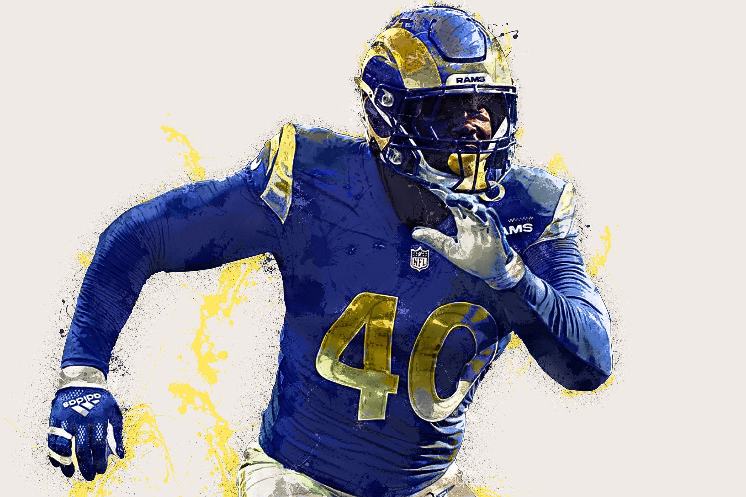 Beautiful watercolor of Von Miller playing for the Los Angeles Rams Superbowl Champions