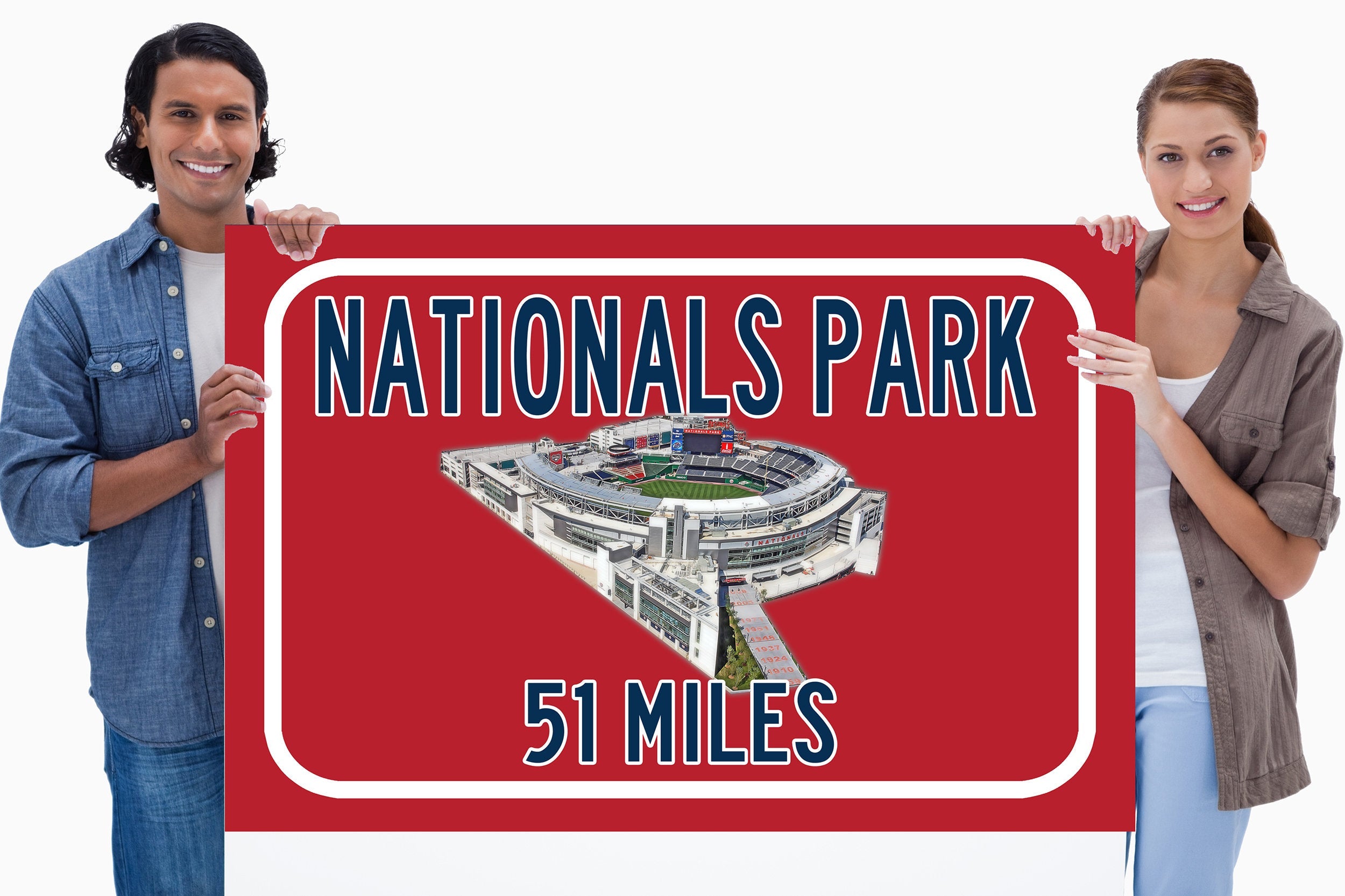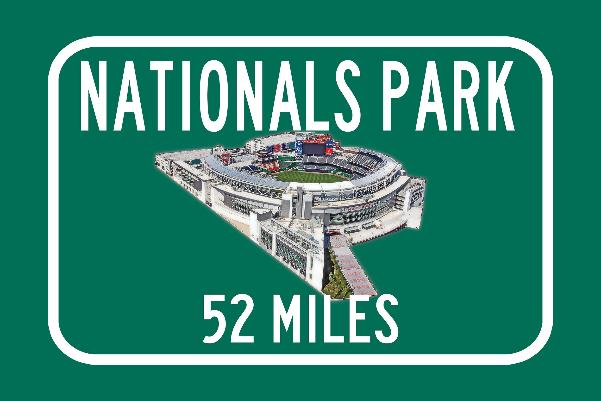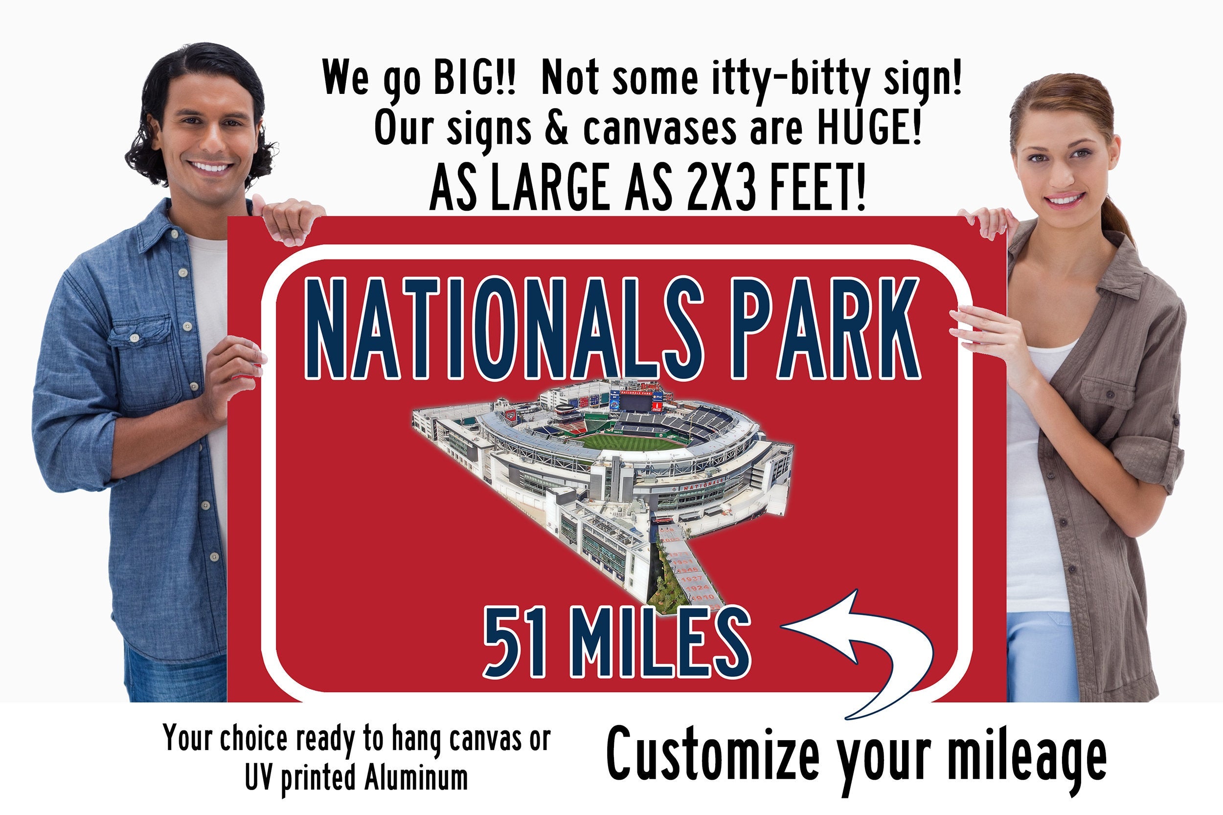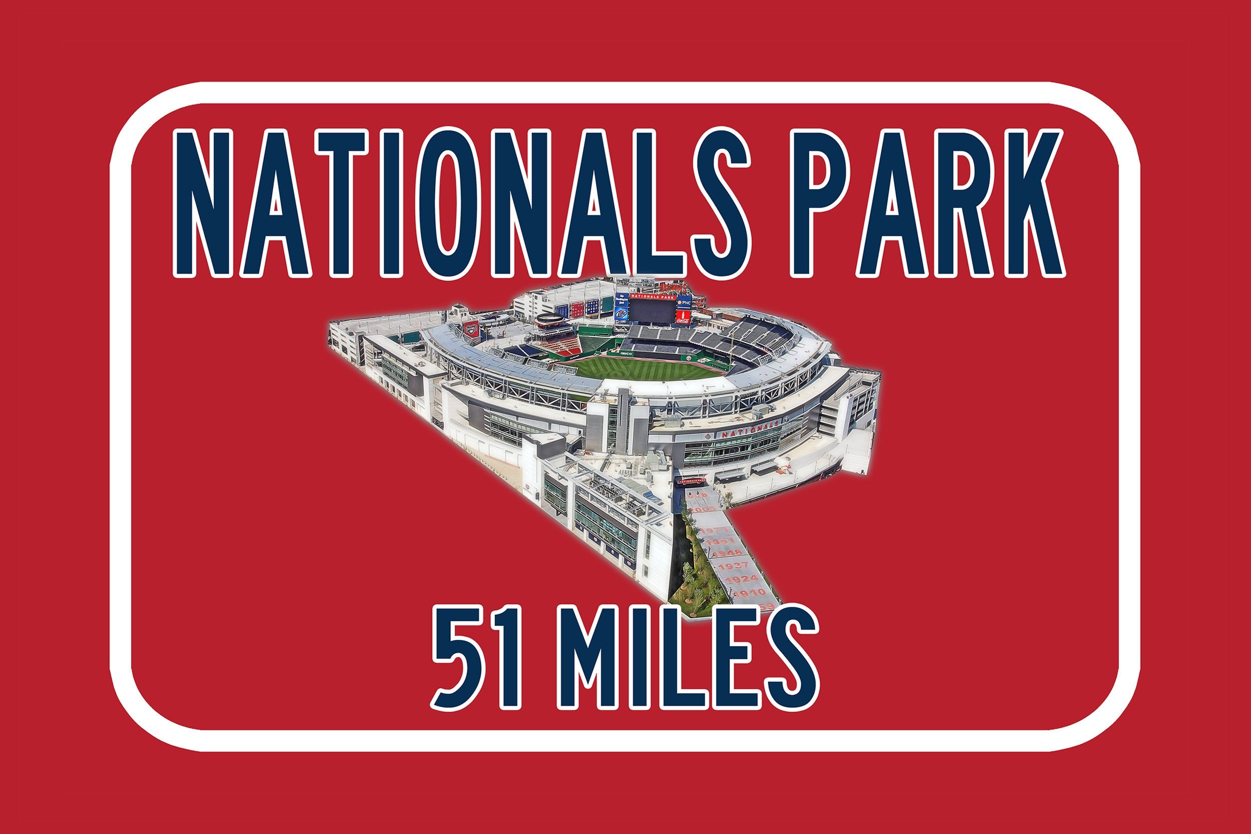 Personalized Highway Distance sign to Nationals Park in Washington . Custom replica road sign, with a watercolor photo of the stadium made with real distance from you to Nationals Park . WE GO HUGE!! Not some itty-bitty sign, Our signs are as large as 2 x 3 FEET! Nationals Park highway sign. Washington Nationals