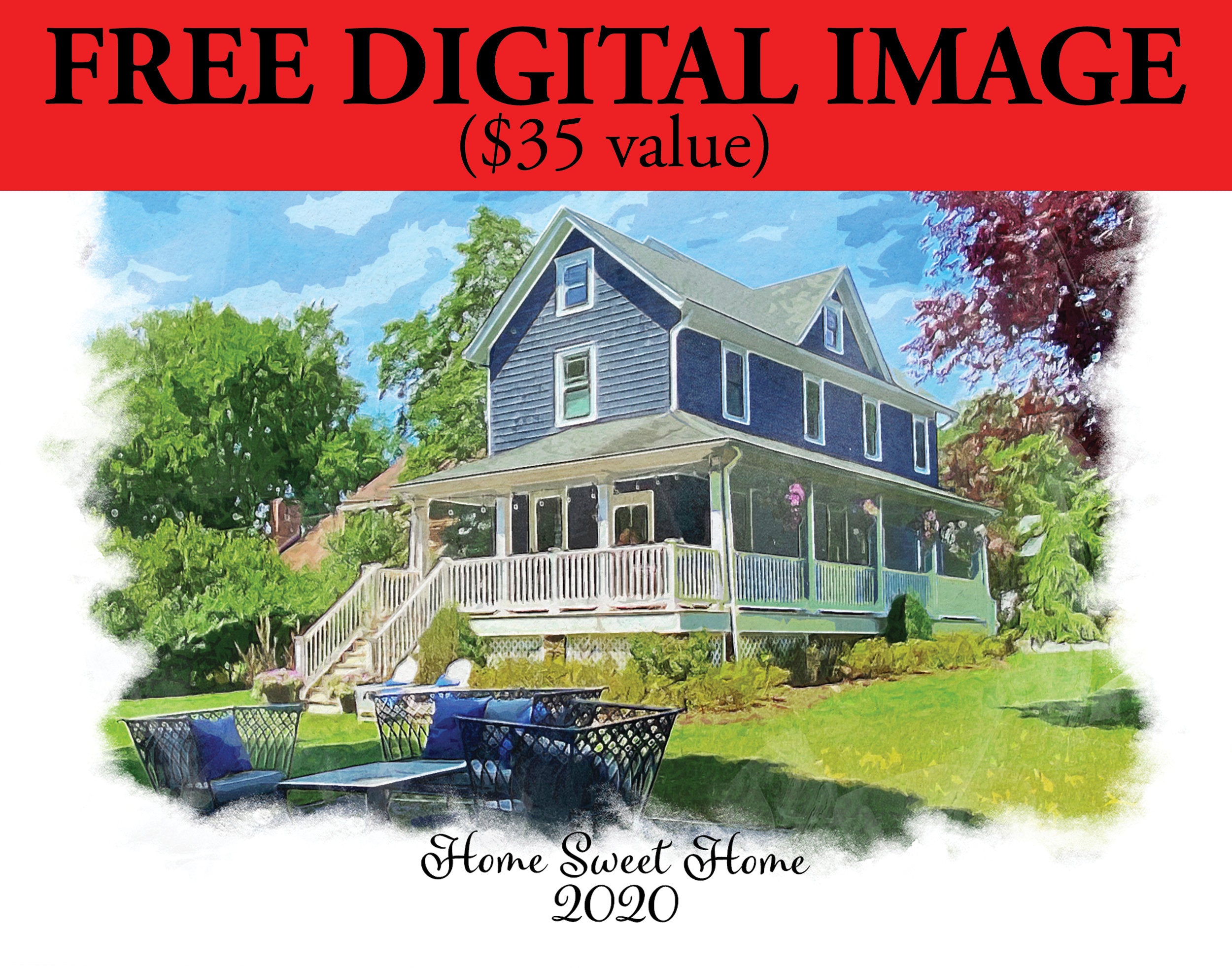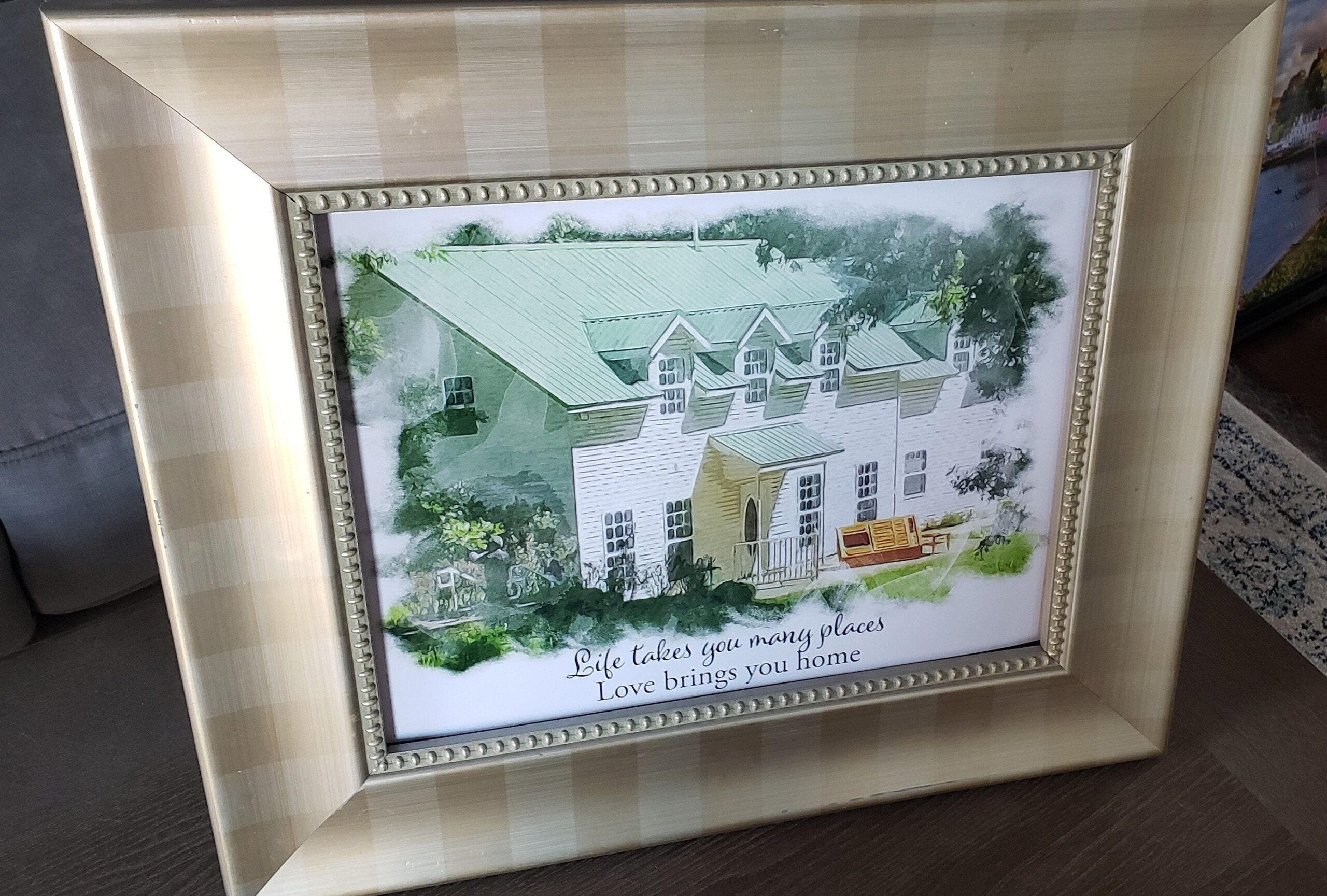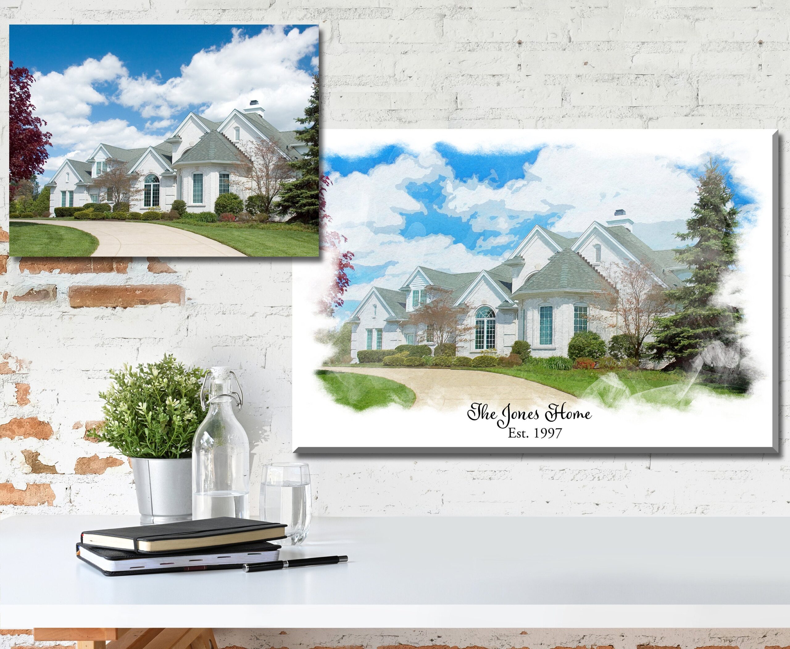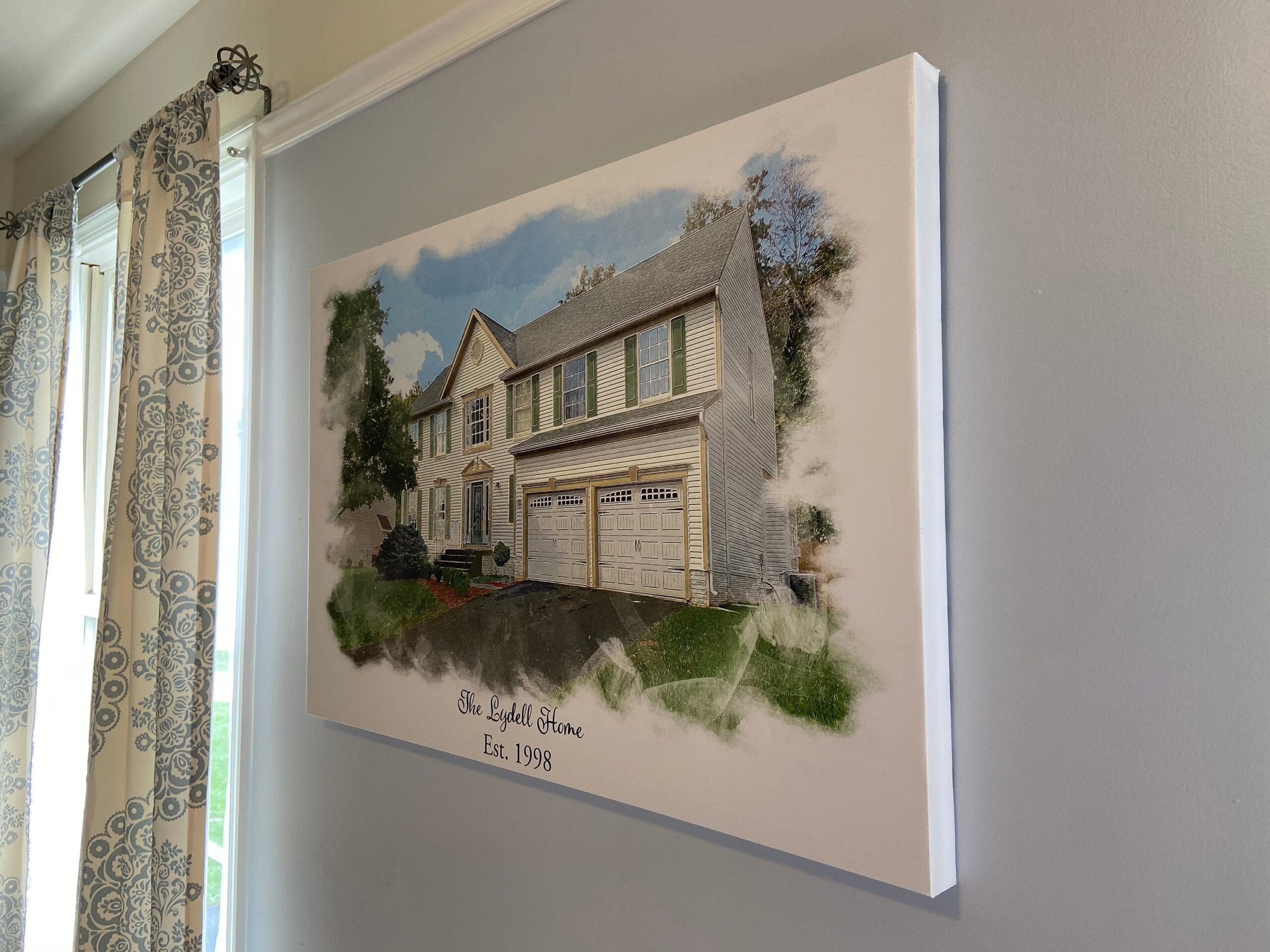 Our custom home canvas is a digitally created, custom watercolor house portrait. Printed and customized with your own text. The perfect gift for a new home buyer, parent’s house or friend’s home, realtor gifts and more…
