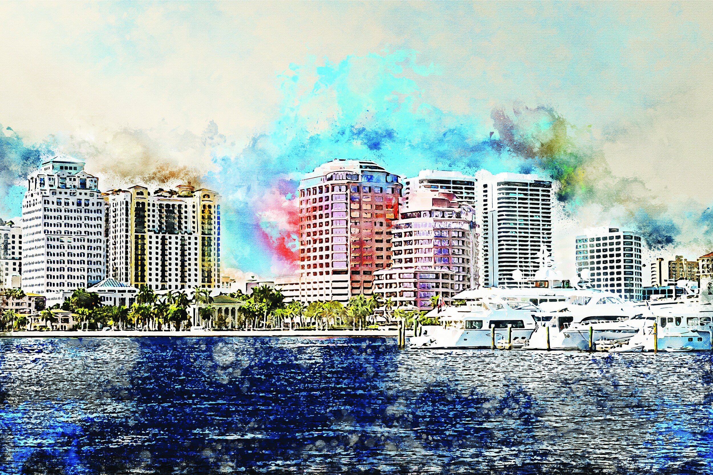 The beautiful watercolor of West Palm Beach on canvas framed and ready to hang. Stunning colors that make for the perfect wall decor. West Palm Beach watercolor canvas skyline