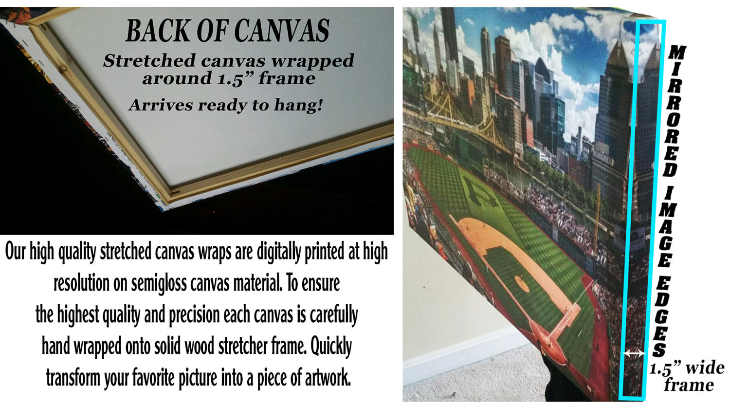 3. Unlike many others, we use 1.5″ stretcher bars to mount our canvases which are twice as big as the typical canvas seller. That 1.5″ look makes our canvases so impressive.
